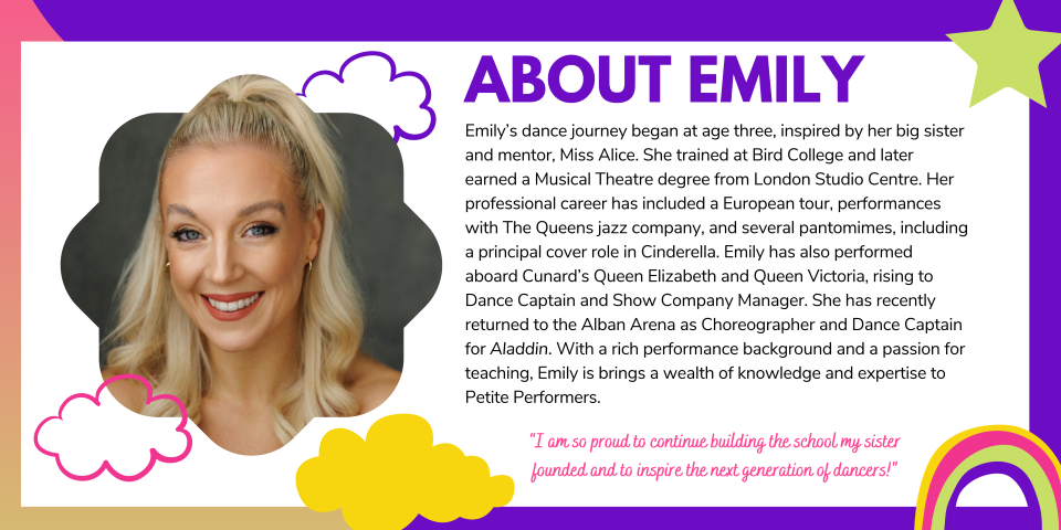Please be aware that the nature of dance and drama classes means your Petite Performers teacher may, from time to time, need to have physical contact with your child. You must inform your Petite Performers representative in writing before the start of your first class if you do not wish the teacher to have any physical contact with your child.